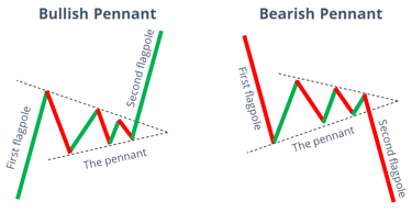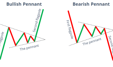 Pennants are small symmetrical triangles that form after strong price movements, indicating a brief consolidation.