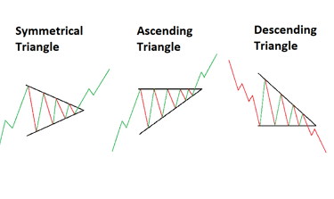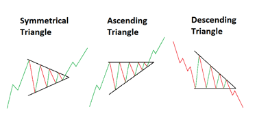 Triangles are continuation patterns that suggest a temporary consolidation before the prevailing trend resumes.