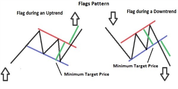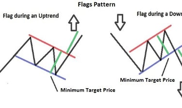 Flags are short-term continuation patterns that signal a brief consolidation before the prevailing trend resumes.
